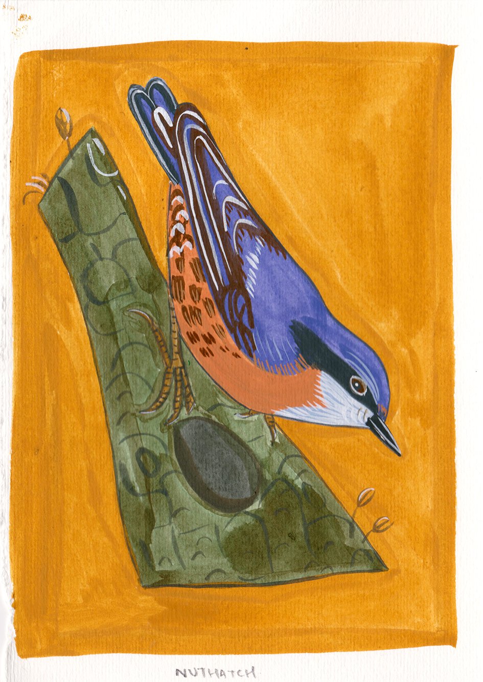 An original painting of a Nuthatch creeping down a tree trunk.